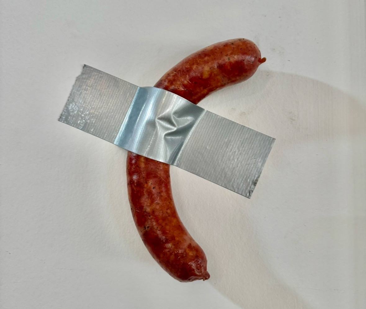 ผลงานชิ้นนี้ตั้งคำถามถึงความแตกต่างที่เปราะบางระหว่างสิ่งดำรงชีพและสัญลักษณ์อย่างท้าทาย โดยแขวนไส้กรอกที่ดองแล้วซึ่งประดิษฐ์ด้วยมือด้วยเทปกาวอุตสาหกรรมไว้บนผนังที่ไม่มีการประดับประดา ผลงานชิ้นนี้สร้างบทสนทนาระหว่างสิ่งที่ไร้สาระและสิ่งสำคัญ สิ่ง ที่เน่าเสียง่าย และสิ่ง ที่เก็บรักษาไว้